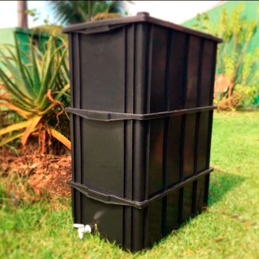 A composteira caseira funciona em três níveis empilháveis. No andar superior, você deposita os resíduos orgânicos misturados com matéria seca (folhas, papel picado, serragem). Quando essa primeira bandeja enche, ela vai para o andar do meio, onde o húmus formado entra em descanso e finaliza a maturação. Já a bandeja do meio sobe para receber novos resíduos. O último andar, na base, coleta o chorume, um líquido rico em nutrientes que pode ser diluído e usado como fertilizante natural. Todo o processo é livre de odores e ideal para uso doméstico, mesmo em espaços pequenos.