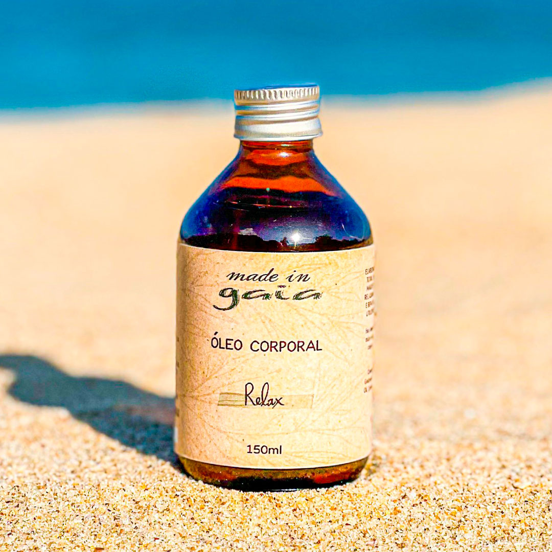 Composição do Óleo Corporal Relax: Terniflora Seed Oil, Prunus Amydalus Dulcis Oil, Persea Gratissima Oil, Lavandula officinalis Flower Oil, Citrus aurantium dulcis Peel Oil, Cymbopogon flexuosus Oil, Tocopheryl Acetate, Rosaceae (Rosehip Oil).
